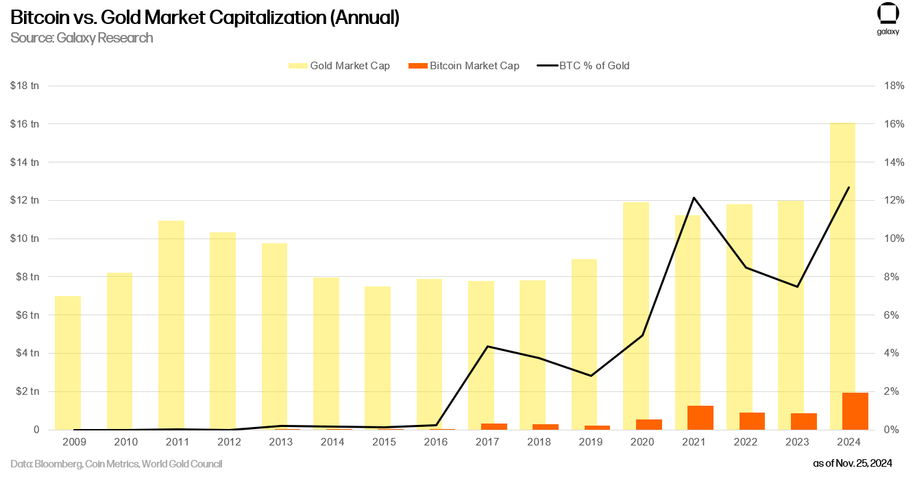 Bitcoin is also expected to gain further traction in investment markets. US-based spot Bitcoin ETFs could collectively manage over $250 billion in assets, reinforcing BTC’s role as a leading alternative asset. By 2025, its market cap may rival 20% of gold’s valuation, solidifying its position as a top-performing investment.