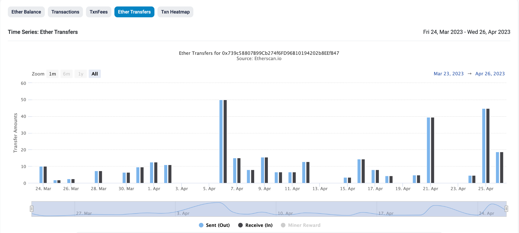 The chart below shows that the amount sent out from the wallet has remained almost equal to the amount received.