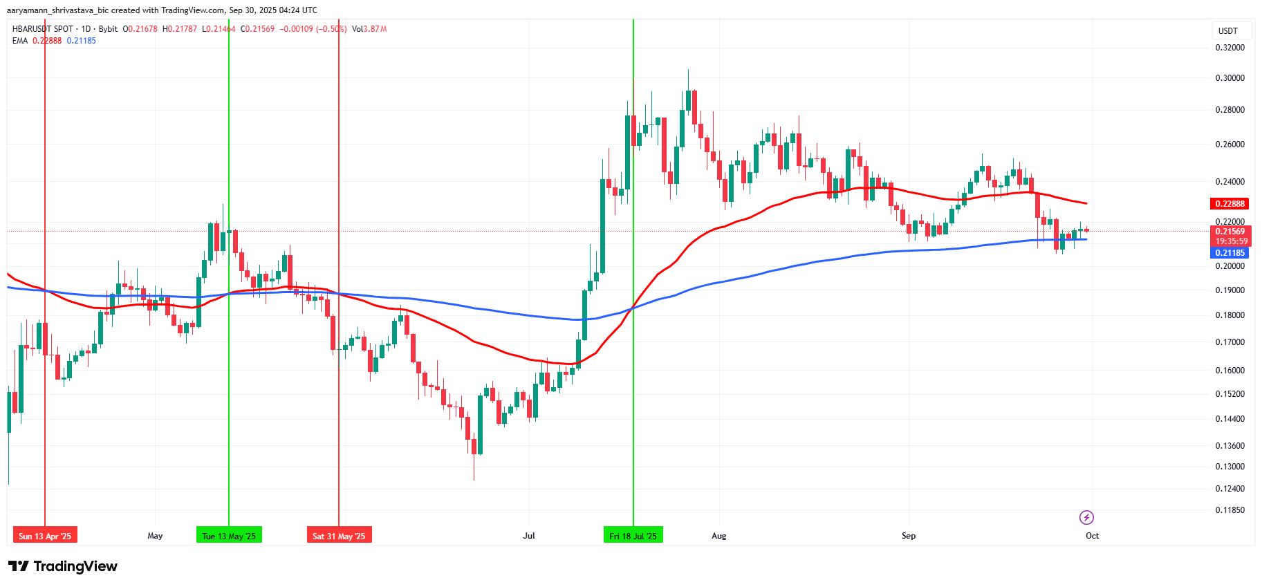 HBAR’s price currently trades at $0.215 within a descending wedge pattern. It sits just above support at $0.213 while struggling to break $0.219 resistance. Although wedges often resolve positively, a decisive breakout remains distant, with the key barrier standing near $0.230.