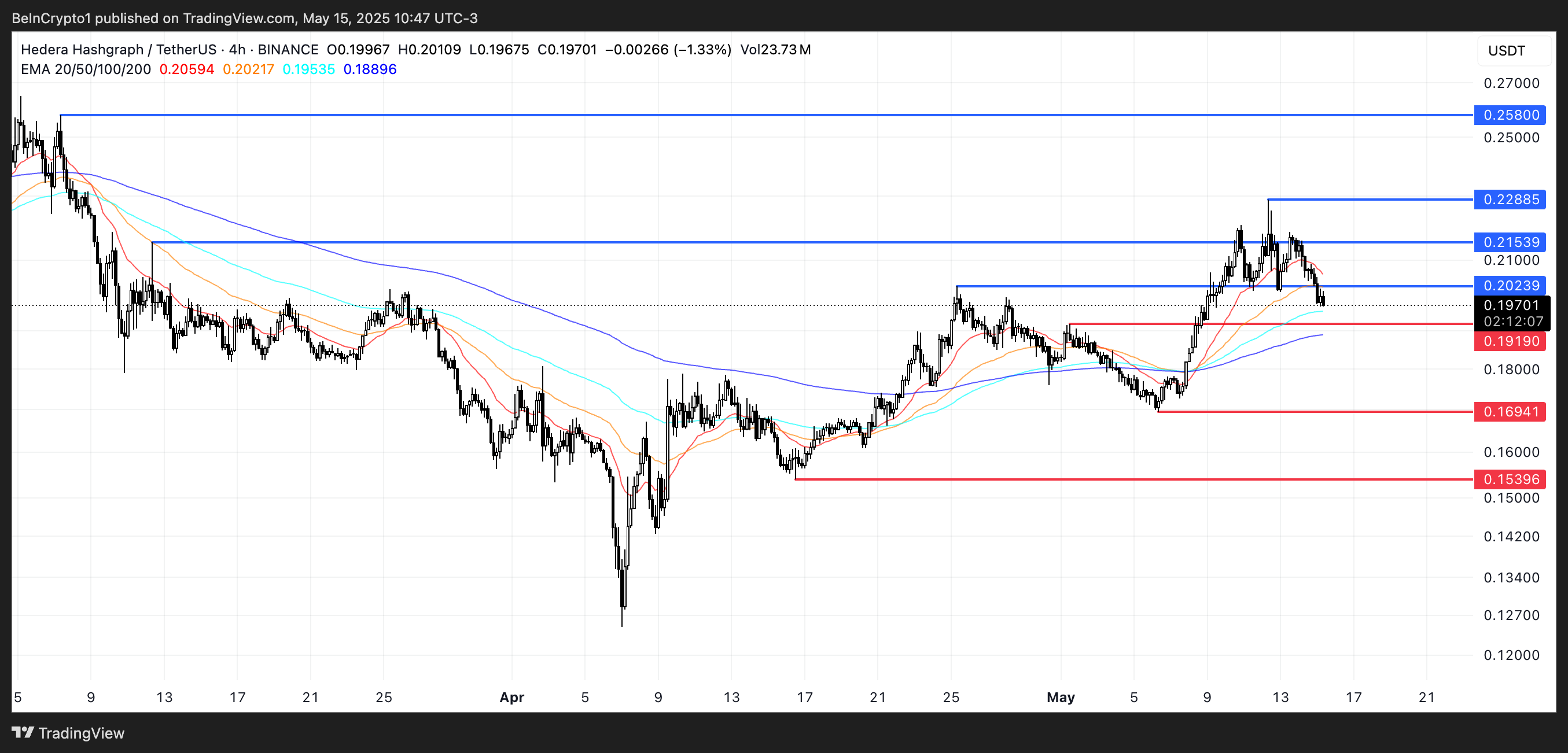 Price action remains caught between key support and resistance levels, while EMA lines still hold a bullish structure—though short-term averages are starting to curve downward. Whether HBAR breaks lower or recovers will likely depend on how it reacts around the $0.191–$0.202 range in the coming sessions.