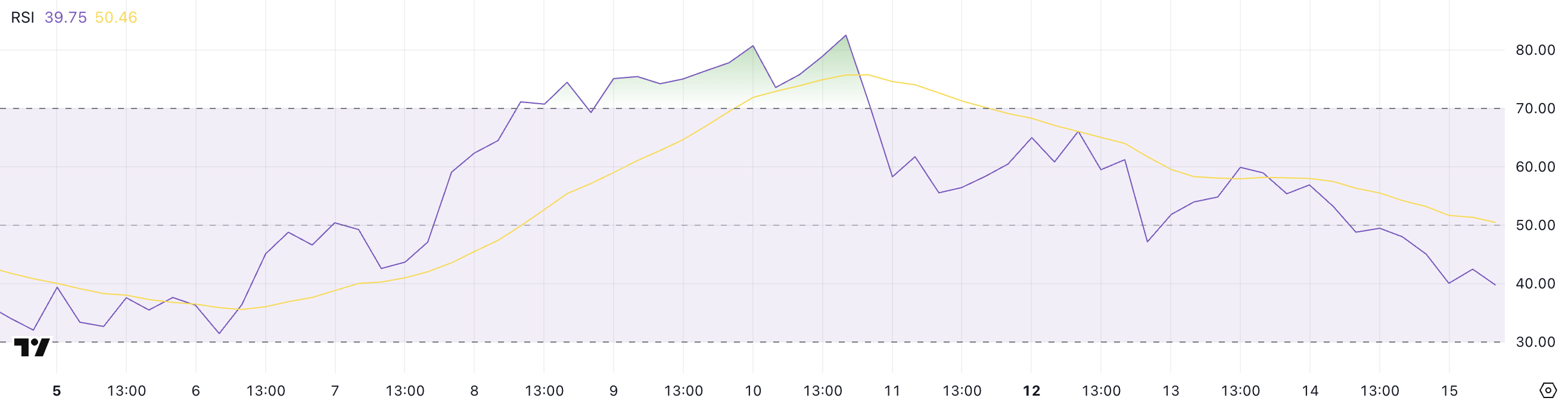 Hedera’s RSI has dropped significantly to 39.75, down from 59.88 two days ago and a recent high of 82.53 just five days ago.
