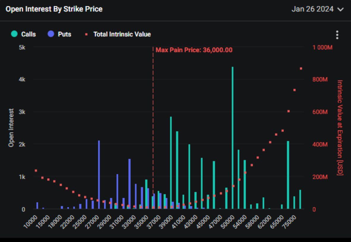 The notional value of today’s batch of BTC contracts is $1.4 billion. The put/call ratio is 0.84, meaning slightly more call sellers than puts. Max pain price is currently around $36,000.