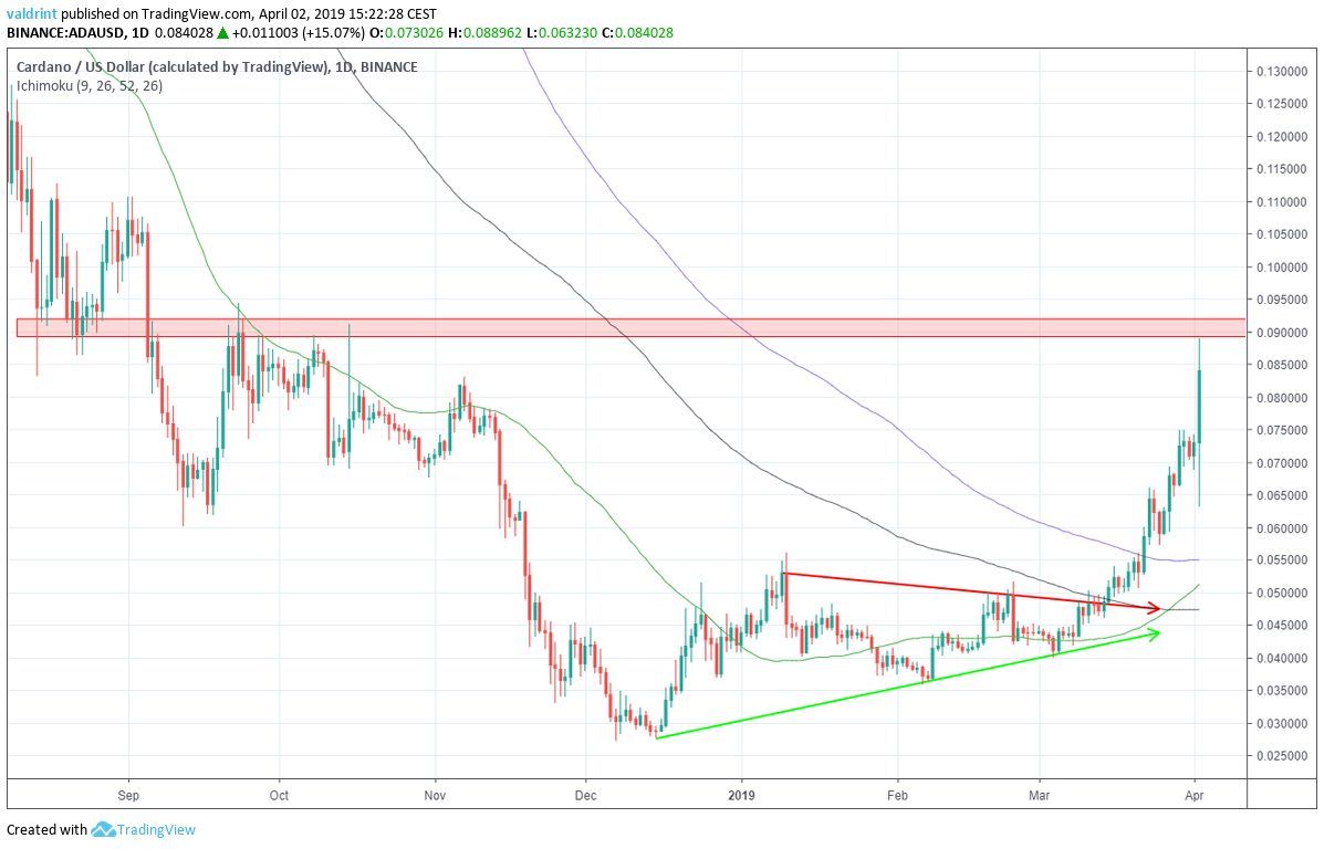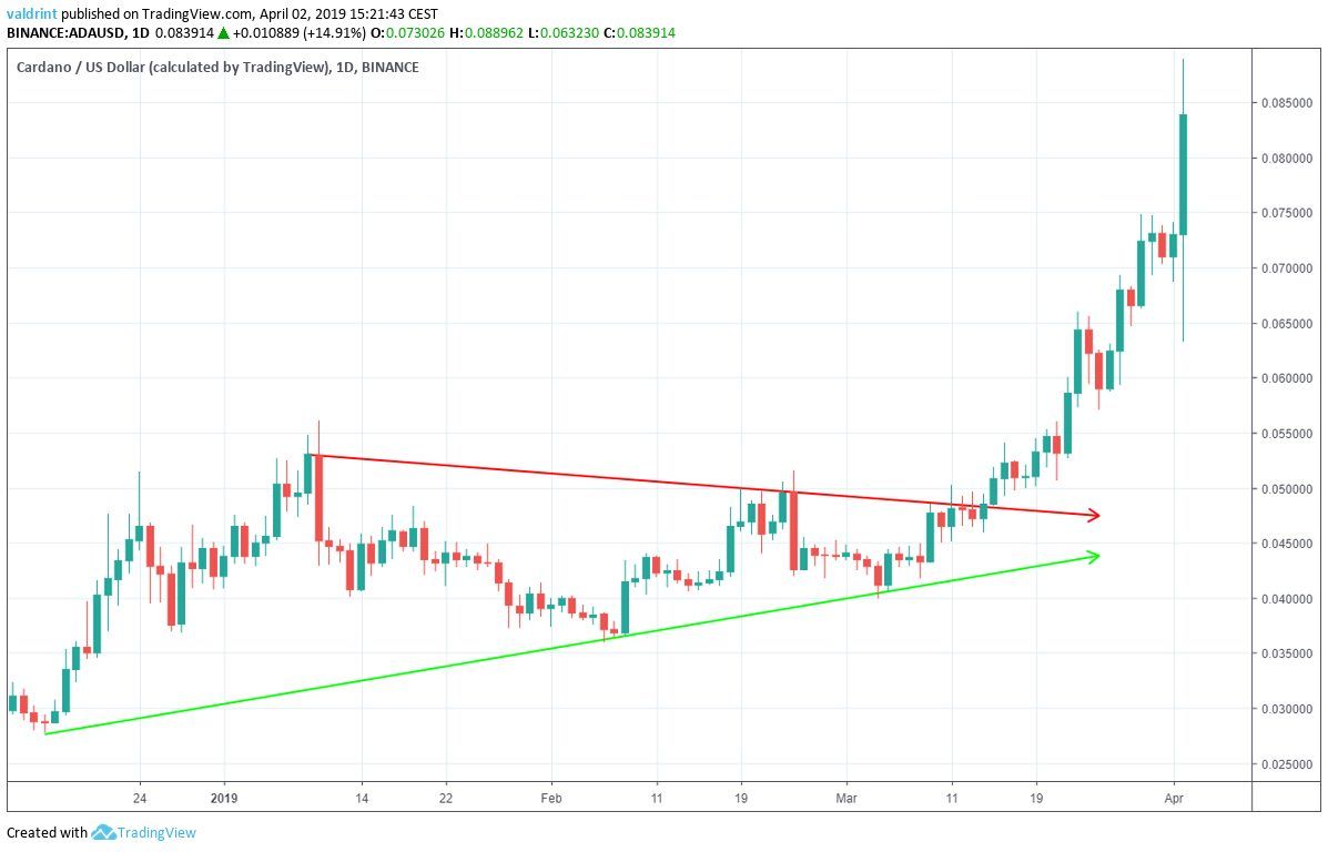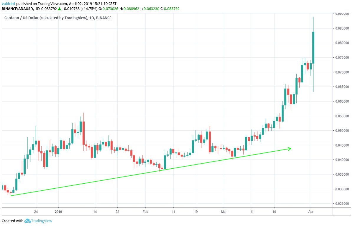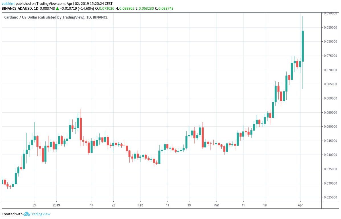 A rapid spike occurred at the beginning of April 2019. At the time of writing, Cardano had already reached a high of $0.088 on Apr 2.