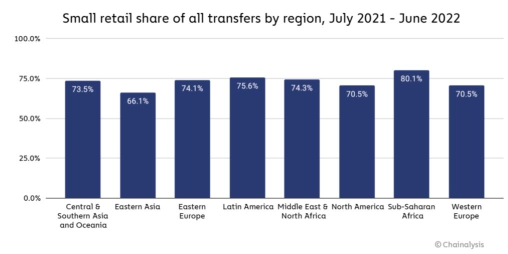 Notably, the report finds that crypto usage this year is driven by daily necessity as opposed to speculation by the wealthy, adding, “The number of small retail transfers actually grew starting at the onset of the bear market in May, while the number of transfers of other sizes fell.”