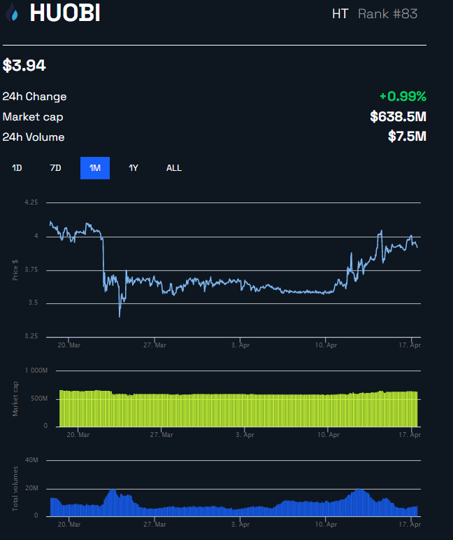 After Huobi’s latest burn, the circulating supply of its HT token is 203.1 million HT. The asset’s price is currently trading at $3.94, down 90% from its all-time high and up 1% in the last 24 hours.