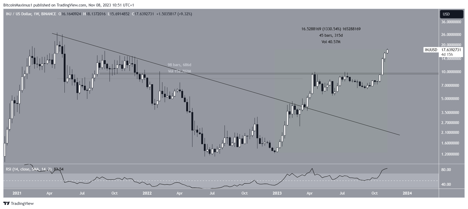 The Injective price has increased swiftly since the beginning of the year. In a little over 300 days, the price has moved upward by 1,330%.
