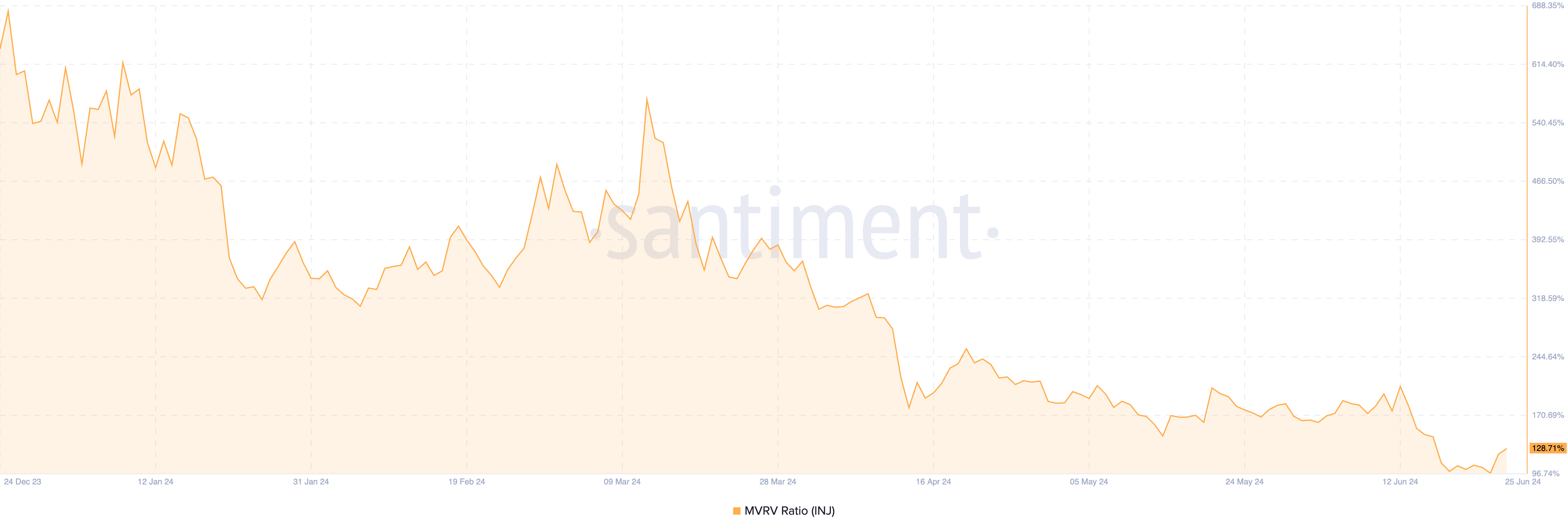 INJ’s Market Value to Realized Value (MVRV) ratio confirmed that the coin may be overvalued. As of this writing, the metric’s value is 128.71%.