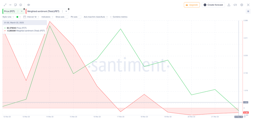 Furthermore, the negative social perception among Fetch.ai network participants could be considered another bullish signal. From a euphoric score of 4.91 on March 12, the weighted sentiment has swung negative to reach -0.28 as of March 23.