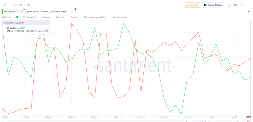 Data from blockchain analytics firm Santiment shows a significant cluster of whales appears to be positioned strategically for future FET price gains. The wallet addresses on the Fetch.ai network with balances between 10 million to 100 million FET have increased their holdings in recent weeks.