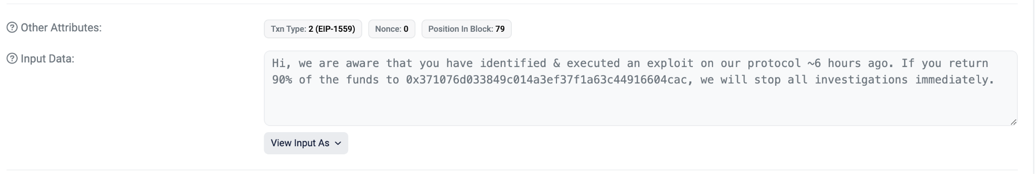 SponsoredThe team acknowledged the exploit and sent an on-chain note to the hacker, asking them to return 90% of the funds.