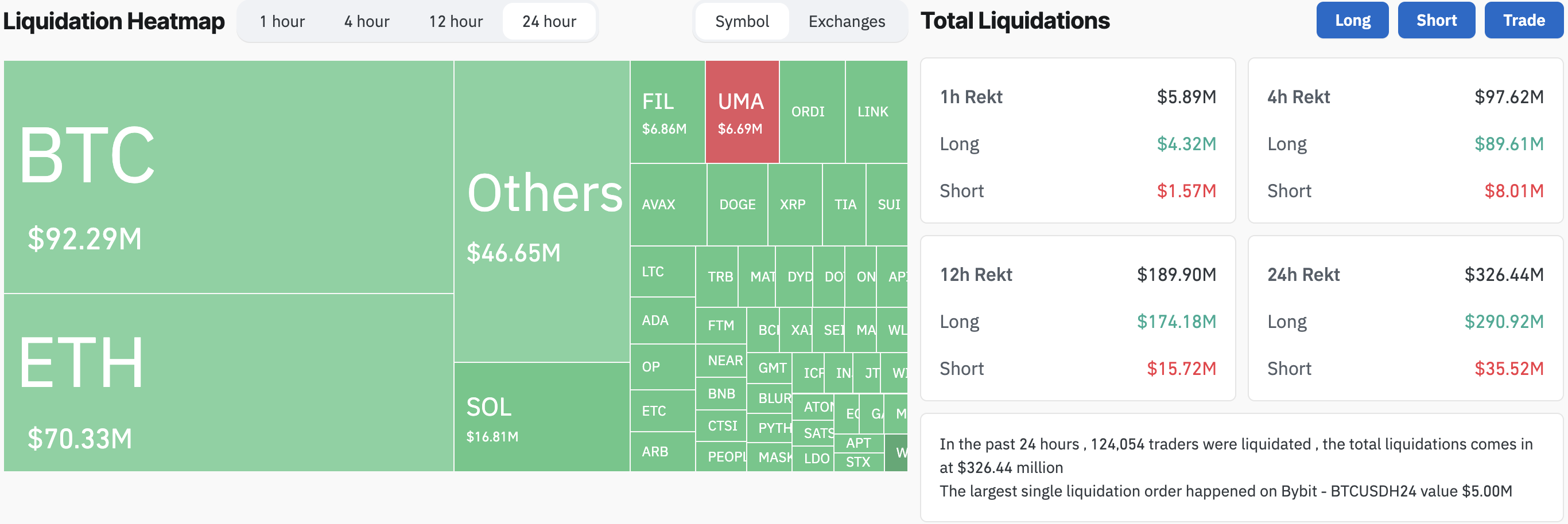 This recalibration of expectations comes as the broader crypto market faces a correction. Bitcoin’s price has fallen below $39,000, marking a decline of over 5% in the past 24 hours. Similarly, Ethereum, another major crypto asset, has decreased 7.5%. These market shifts have led to significant liquidations, totaling over $326 million in the same timeframe.