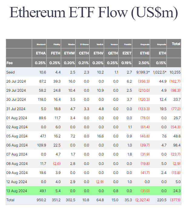 Specifically, ETHA recorded inflows of $49.1 million, bringing its total inflows to $950.2 million. On the other hand, Grayscale’s ETHE continues to grapple with negative flows, recording total outflows of $2.327 billion. This reflects the divergent performance between the two prominent Ethereum ETFs, with Grayscale’s case ascribed to customer redemptions as it happened for Bitcoin in January.
