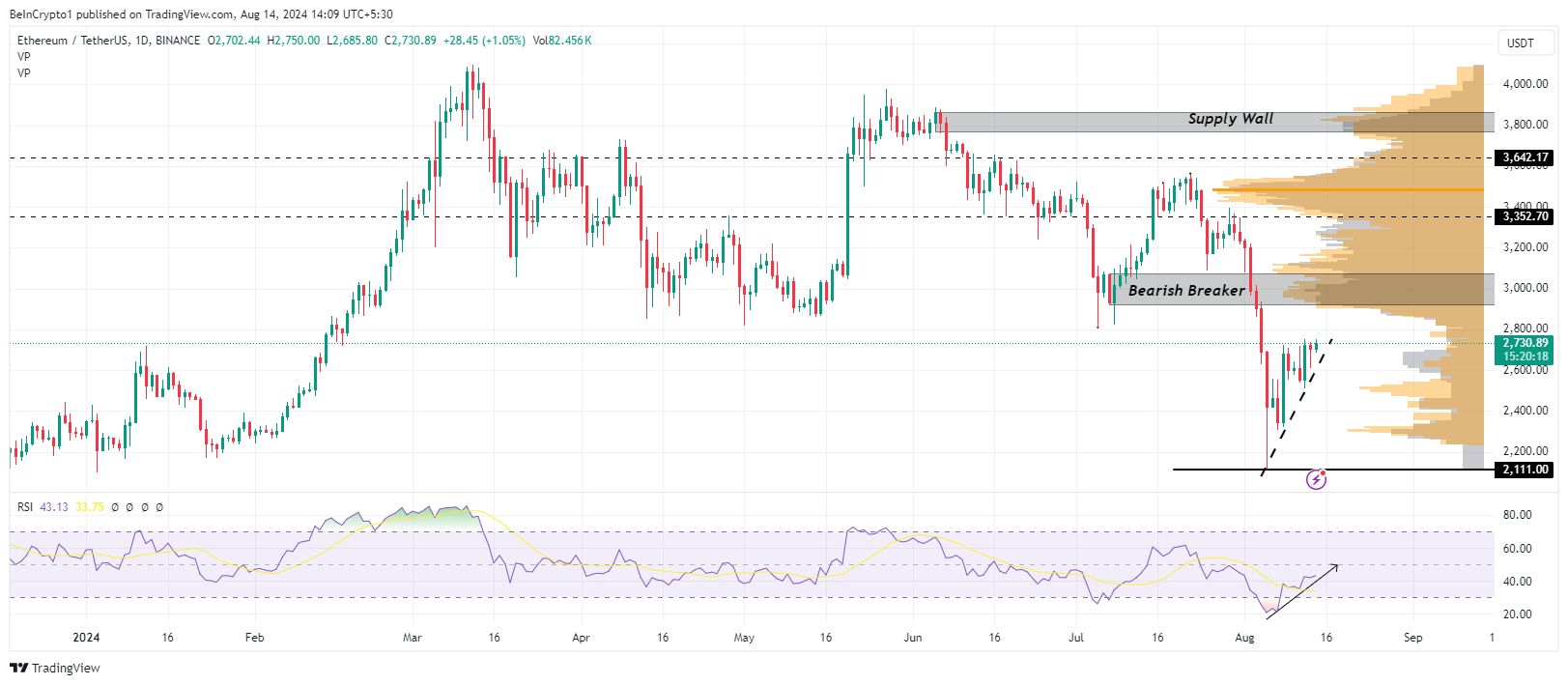 Ethereum’s price has surged nearly 30% since bottoming out at $2,111 on August 5 amid ongoing recovery efforts. The daily chart reveals a pattern of higher lows in both the price and the Relative Strength Index (RSI), indicating increasing bullish momentum. This momentum could strengthen further if the RSI decisively moves above the 50 mark.