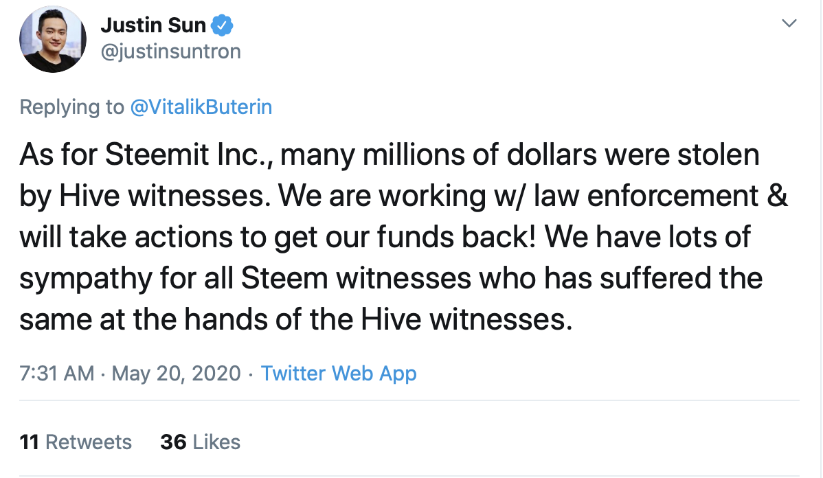 In a recent tweet, Sun alleged that ‘many millions of dollars were stolen by Hive witnesses.’ He also claims to be working with law enforcement to get the funds back.