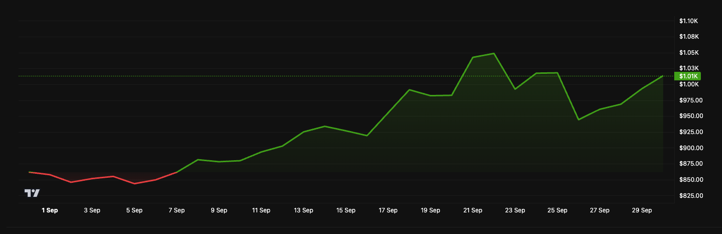 Following the news, BNB rose 4.7% over the past 24 hours, reaching $1,035. The cryptocurrency had previously peaked at $1,076 on September 21 before dropping to $937, but has now rebounded strongly. During the same period, Bitcoin recovered 1.9% to reclaim $114,000, while Ethereum climbed 2.3% to surpass the $4,200 mark.