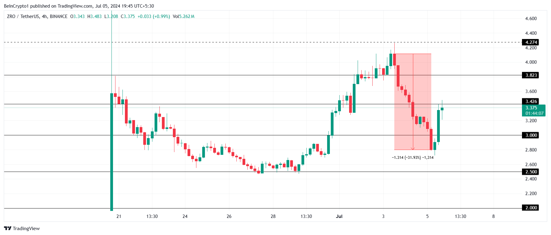 ZRO’s price declined by 32% in the span of 48 hours but noted a 15% recovery over the past day. The altcoin trading under $3.42 is still susceptible to a decline as the bearish cues remain persistent. This could result in ZRO falling through the support at $3.00.