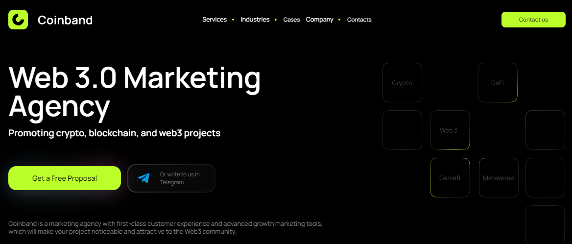 Notably, the agency has received numerous rewards for its outstanding performance in the marketing field. As a result, Coinband has demonstrated exceptional skill in drawing investors and users to the crypto space. The company’s experience spans multiple fields, including DeFi, fintech, metaverse, NFTs, exchanges, and more.
