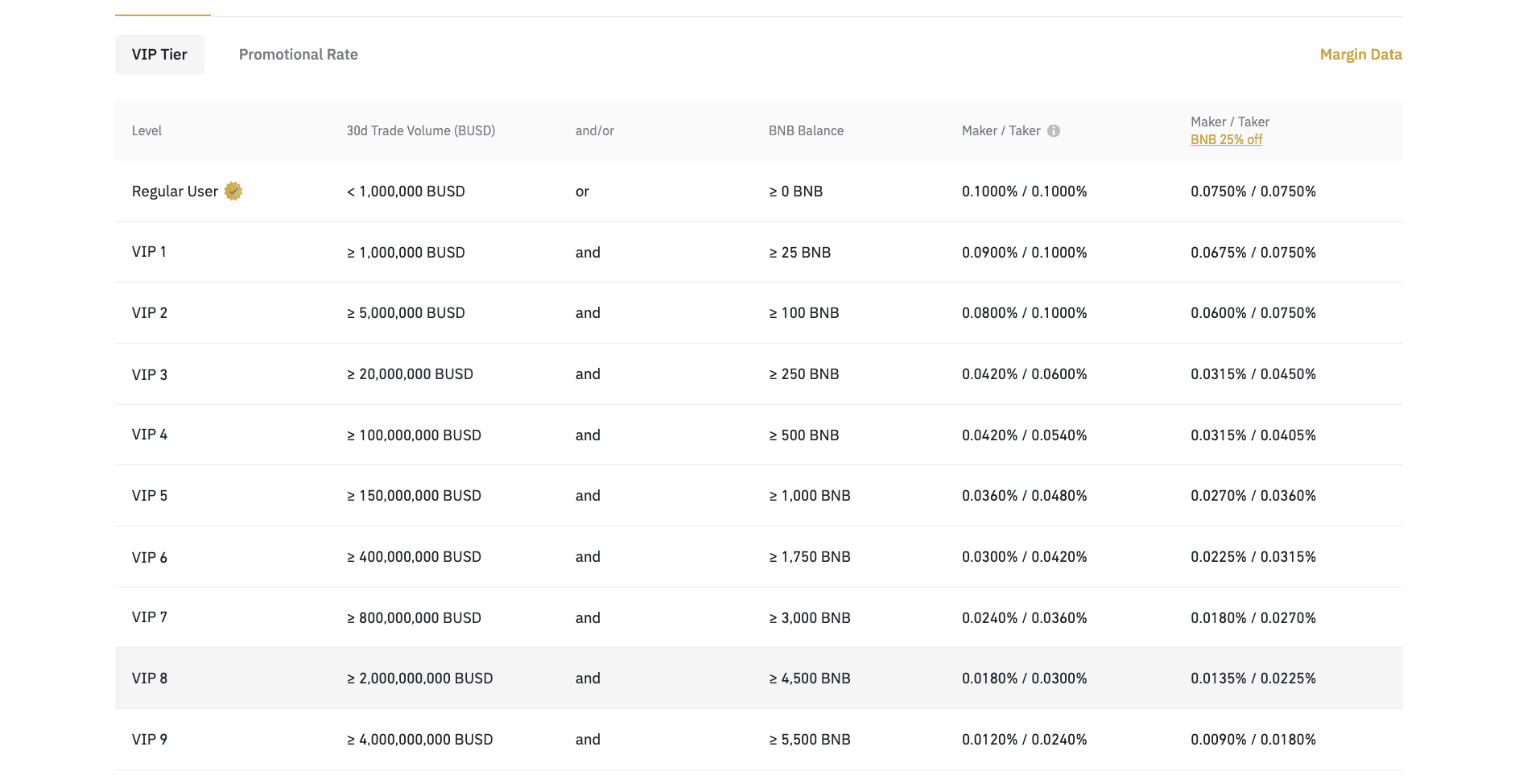 For USDT-M futures, trading fees start at 0.0200% for the maker and 0.0400% for the taker. The levels go as low as 0.012% and 0.030% for BUSD-M futures. COIN-M futures are priced at 0.01% for the maker and 0.05% for the taker. Do note that these are the “regular user” tiers.
