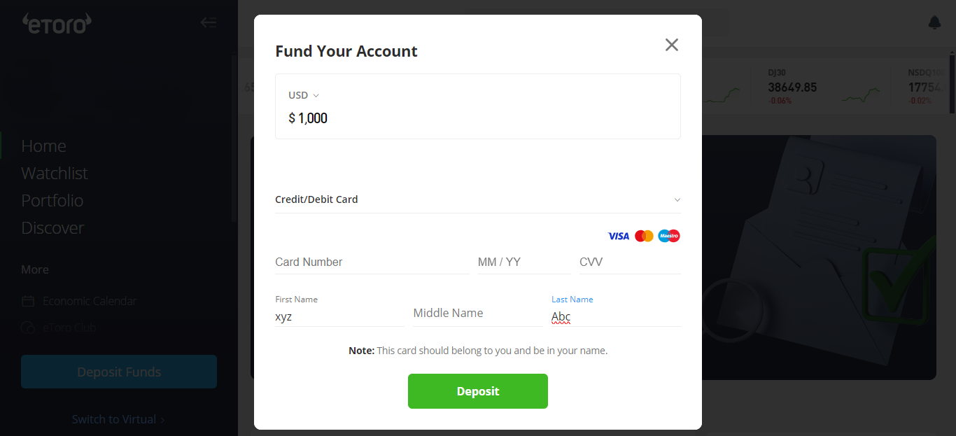 - Once logged in, click “Deposit Funds” on the navigation bar on the left of the dashboard to fund your account. eToro supports several deposit methods, including bank transfers, e-wallets, and credit/debit cards. Choose your preferred method and ensure you meet the minimum deposit required. Credit Cards and PayPal are not available for deposits for users under the FCA regulation