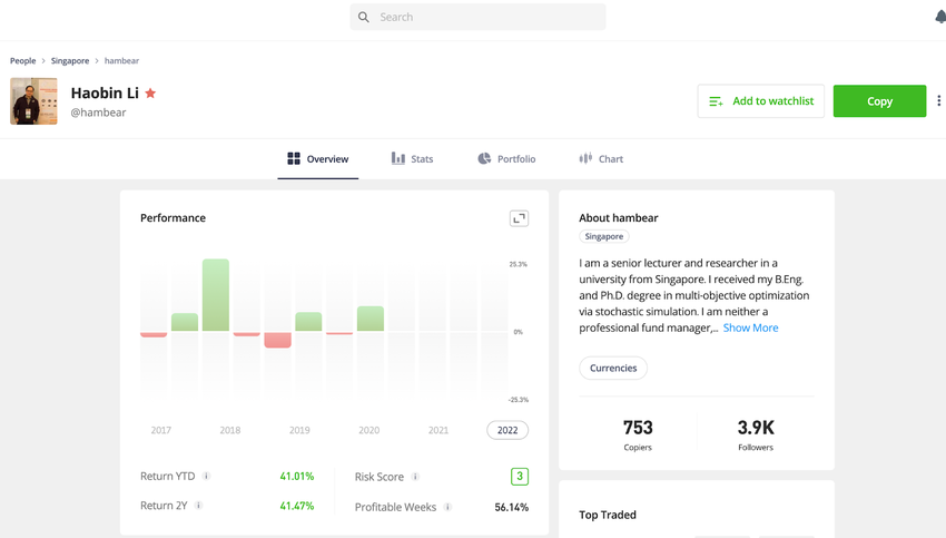 After filtering and selecting the trader that focuses on your preferred assets, you may check out more detailed stats on their profile. You may see how many are already following and copying their positions.