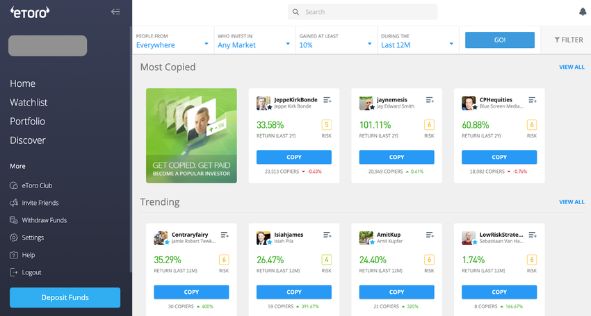 Now let’s take a closer look. Below is a step-by-step guide to copy trading in cryptocurrency. While this example uses eToro, similar features are available on many popular platforms. Although the exact steps may differ slightly, the overall process is consistent across most leading platforms.