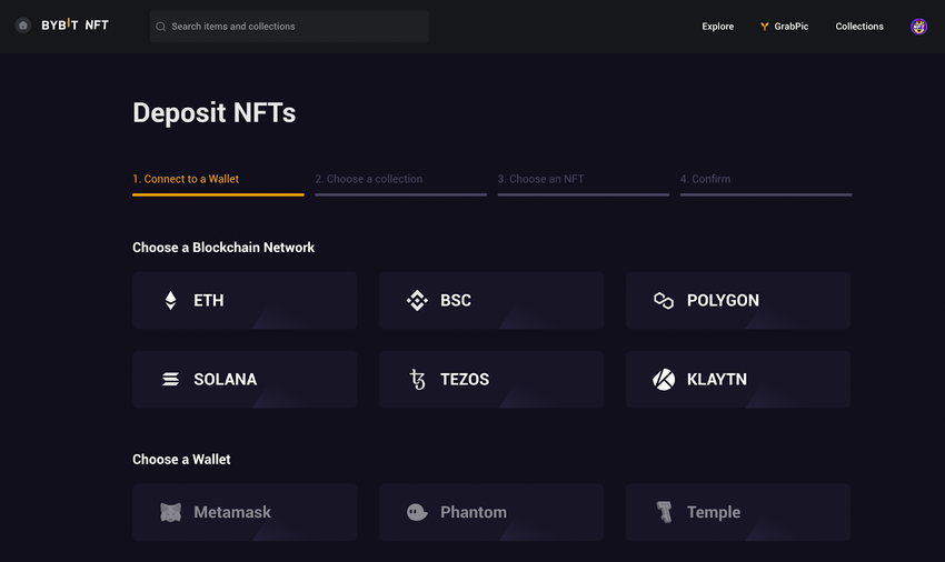 Bybit will let you choose the desired blockchain to deposit your NFT and choose one of the supported crypto wallets. As of mid-June 2023, the Bybit NFT marketplace supports ETH, BSC, Polygon, Solana, Tezos, and Klaytn networks. The wallets you can use are MetaMask, Phantom, Temple, and Kaikas, depending on the chosen blockchain.