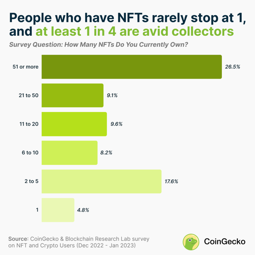 In May 2023, CoinGecko published the results of a survey. The research concluded, “Once people do get into NFTs, they usually seem to keep on buying and collecting more. At least 1 in 4 NFT holders said that they are avid collectors,” and “only 4.8% of NFT holders owned just a single NFT.”