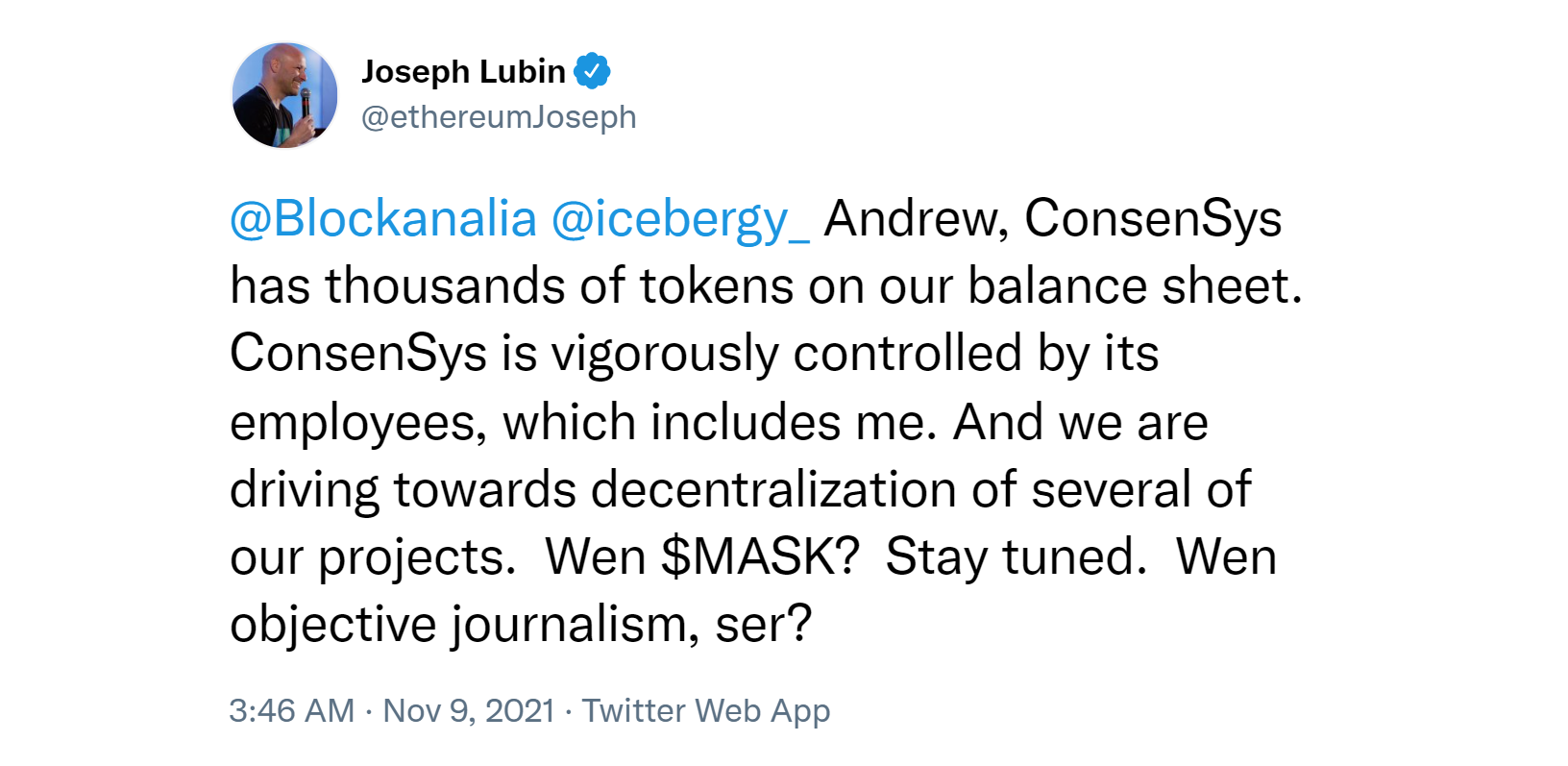 As of January 2022, Metamask doesn’t have a native token, but there has been much speculation that the popular crypto wallet might issue its native token. Joseph Lubin, the co-founder of Ethereum and ConsenSys, has hinted at a possible MetaMask token launch on Twitter.
