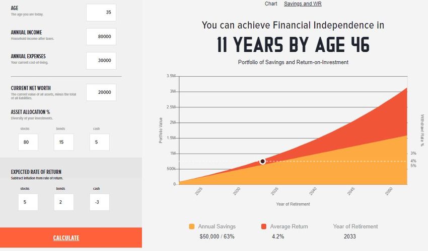 For example, the screenshot above shows a basic early retirement calculator by PlayingWithFire that helps you figure at what age you might achieve financial freedom.