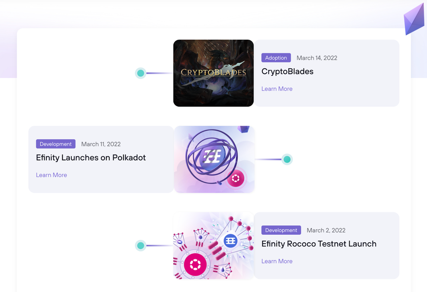 March 2022: A cross-chain pay-to-play game called Crypto Blade via Efinity, the Metaverse Affinity Live on Polkadot for the Enjin community, and Efinity Rococo launched.