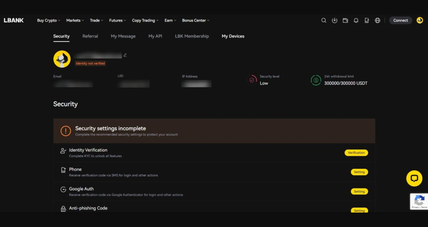 - Navigate to the LBank homepage. In the top right corner, select your account icon to open the menu, then choose Security to begin the KYC process. Follow the instructions and enter your information to complete the verification.