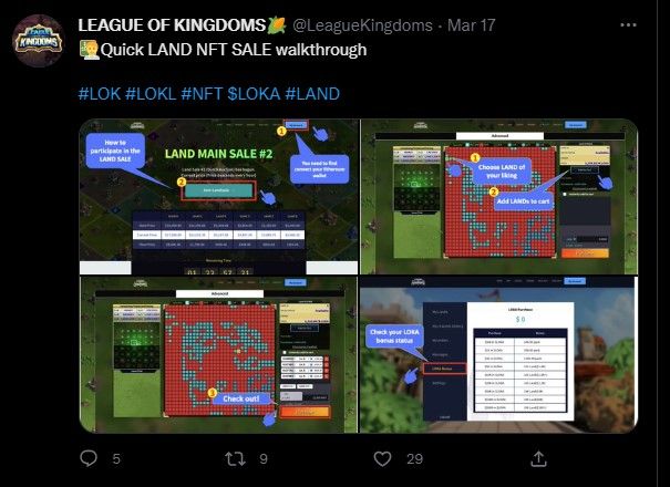 Land properties are virtual real estate NFTs in the game that run on the Ethereum blockchain. They can be purchased directly from the League of Kingdoms Land page, on OpenSea, or PlayDapp. There are 65,536 LAND tokens (or parcels) available for purchase, with a small fraction already taken. Each Land features a 4×4 scale with a capacity to hold up to 16 kingdoms. Other assets in the game that can be traded as NFTs include Dragos, ancient artifacts called Totems, and resources such as food, lumber, and stone.