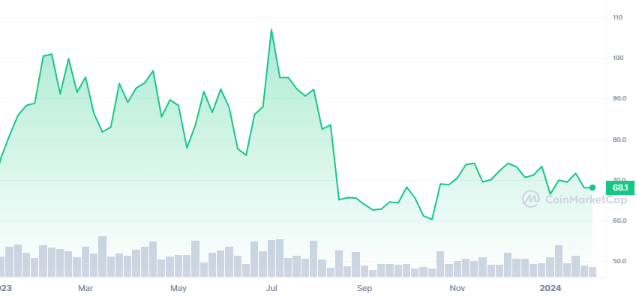 As of February 2024, Litecoin has experienced a year-over-year decline in value. On January 1, 2023, the digital currency was priced at $100. However, by February 1, 2024, it witnessed a depreciation of 32%, indicating a notable decrease in its market value during this period.
