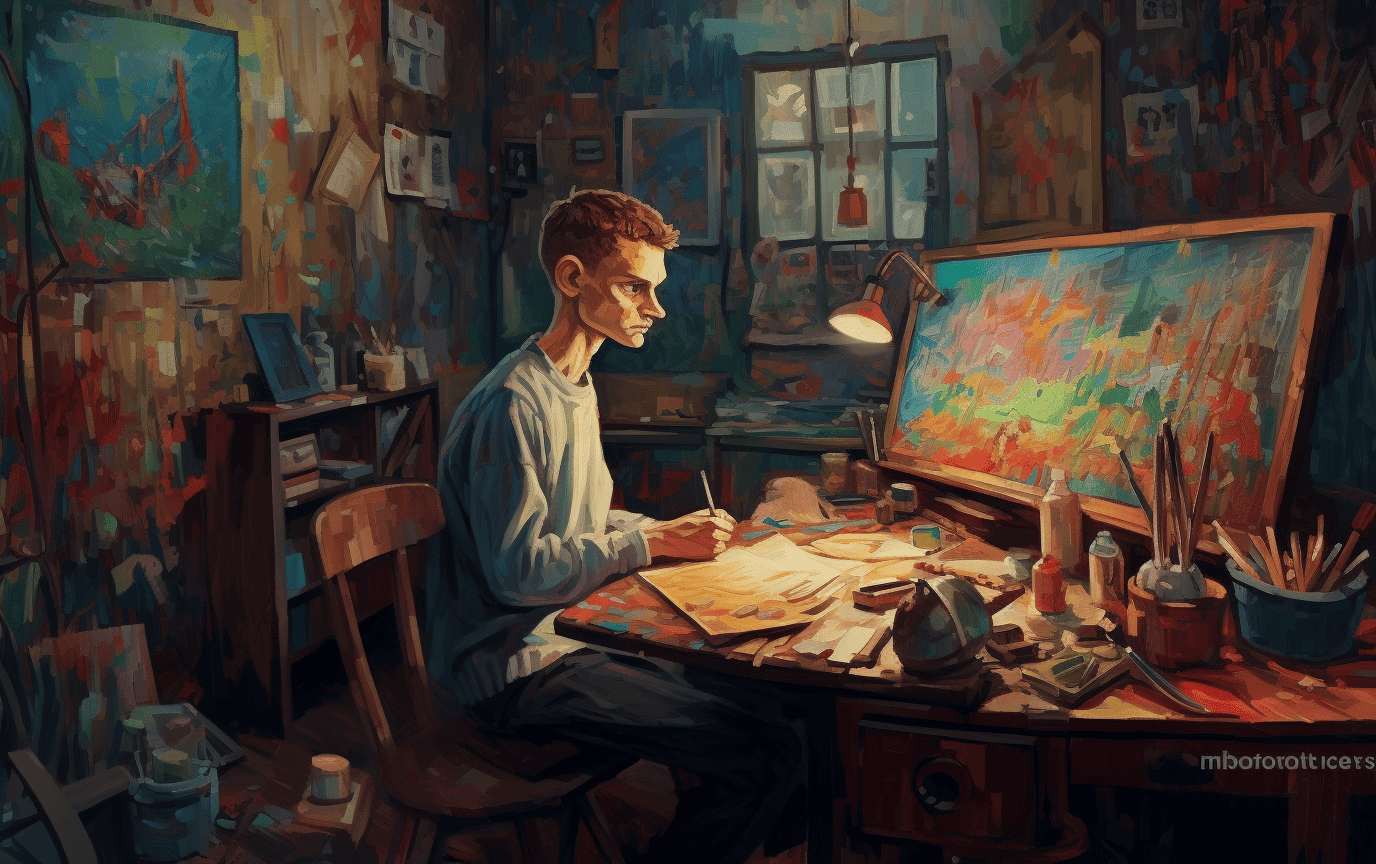 Vitalik Buterin in an art studio, focused on painting a whimsical children’s cartoon on a large canvas, palette in hand. Rendered in a Van Gogh-like impressionist style with bold brush strokes and vibrant colors. –ar 16:10 –s 700 –q 5