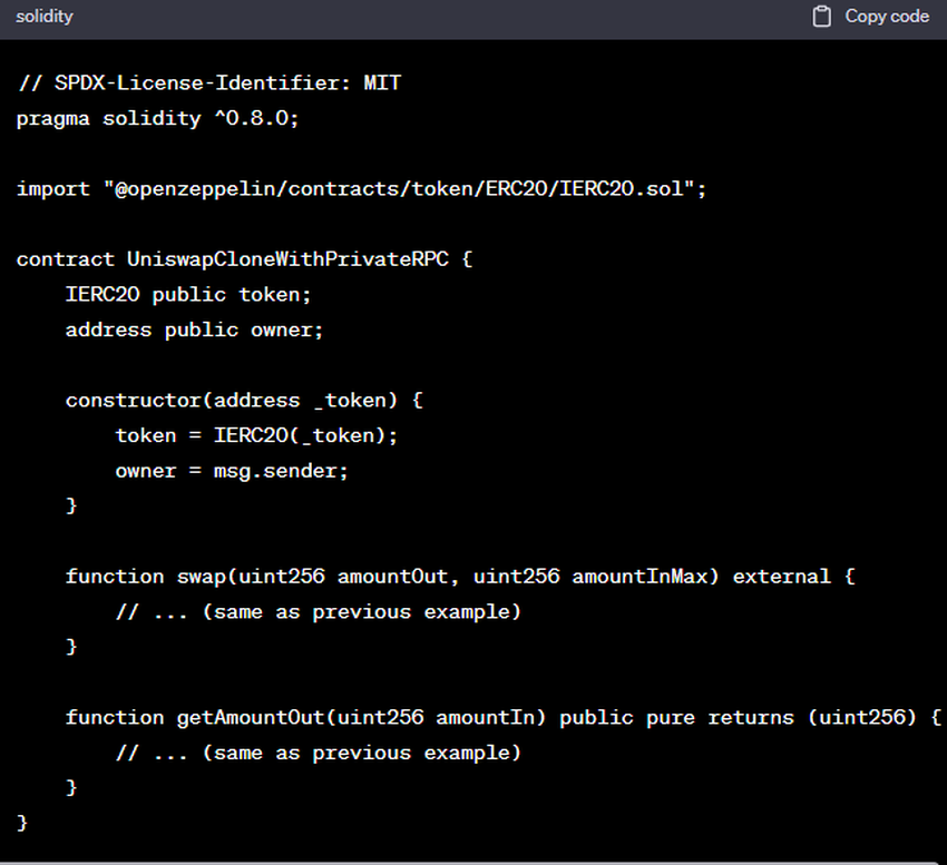Then, you can create a simplified copy of this or that DApp via OpenAI’s ChatGPT, an AI-powered chatbot. Should we request ChatGPT to write for us a Uniswap-like automated market maker (AMM) contract with a private RPC node utilized, it will provide us with the following code (simplified example):