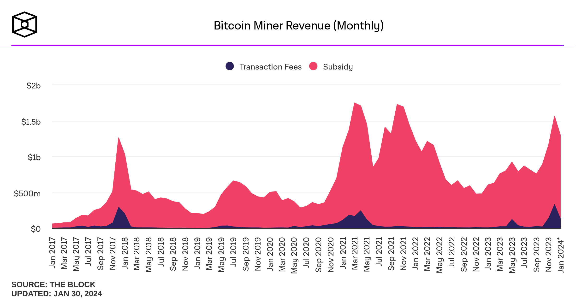 These computers are called mining rigs, and recipients of mining rewards are called miners. Just for the month of January, Bitcoin miners received over $1 billion in mining earnings. Although each Bitcoin halving reduces mining rewards, the skyrocketing Bitcoin price more than makes up for it.