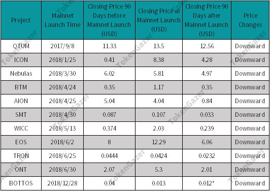 According to research conducted by crypto research house TokenGazer in 2019 of 11 mainnet launches between September 2017 and June 2018, token prices generally “increased before the mainnet launch and dropped after it.” Much of this can be explained by a downtrend in the broader cryptocurrency market at the time.