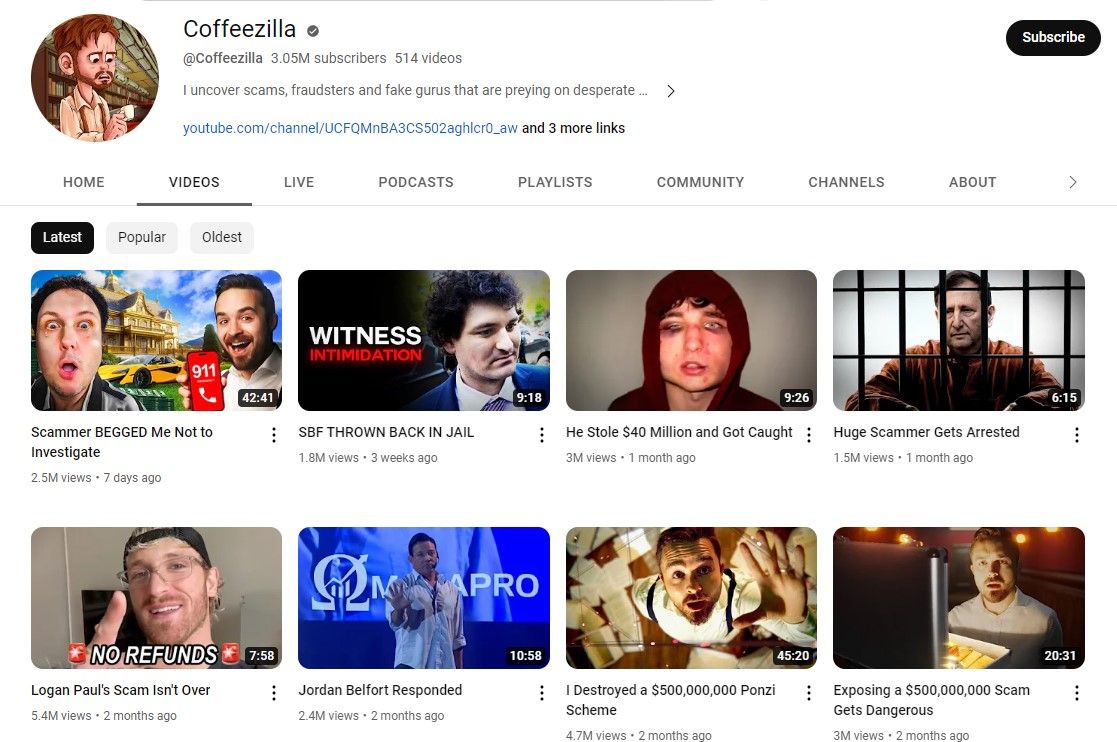 Coffeezilla has called out influencers like Dillon Danis, Jake Paul, Logan Paul, entrepreneurs like Eddie Ibanez and Sam Bankman-Fried, and a suite of prominent crypto scams.