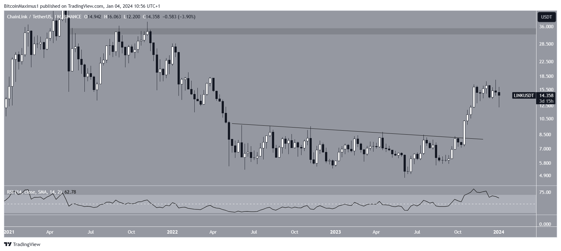 The LINK price was one of the first gainers of the crypto market cycle, beginning a significant upward movement in October after breaking out from a descending resistance trend line. The increase led to a new 2023 high of $17.67 in the final week of December.