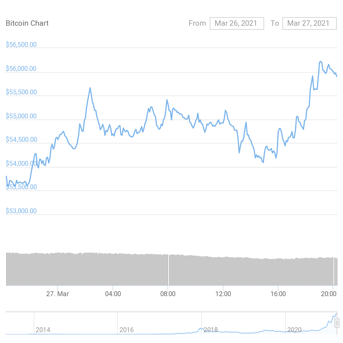 In today’s market roundup, Bitcoin moved slightly upward as the weekend started. The coin broke $56,000 only briefly as Saturday progressed. Market volume declined throughout the day, from $55 billion down to $46 billion at the time this report was published.