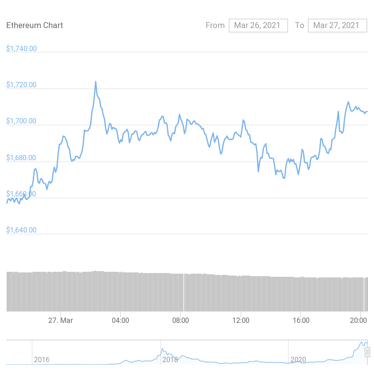 Ethereum also regained ground on Saturday, with a slightly lower rise. The second-ranked coin spiked early on Saturday (UTC) above $1720, but spent most for the day in the $1680 – $1700 range. Market volume also dropped throughout the day. It slid from $24.5 billion to $21.0 billion in 24 hours.
