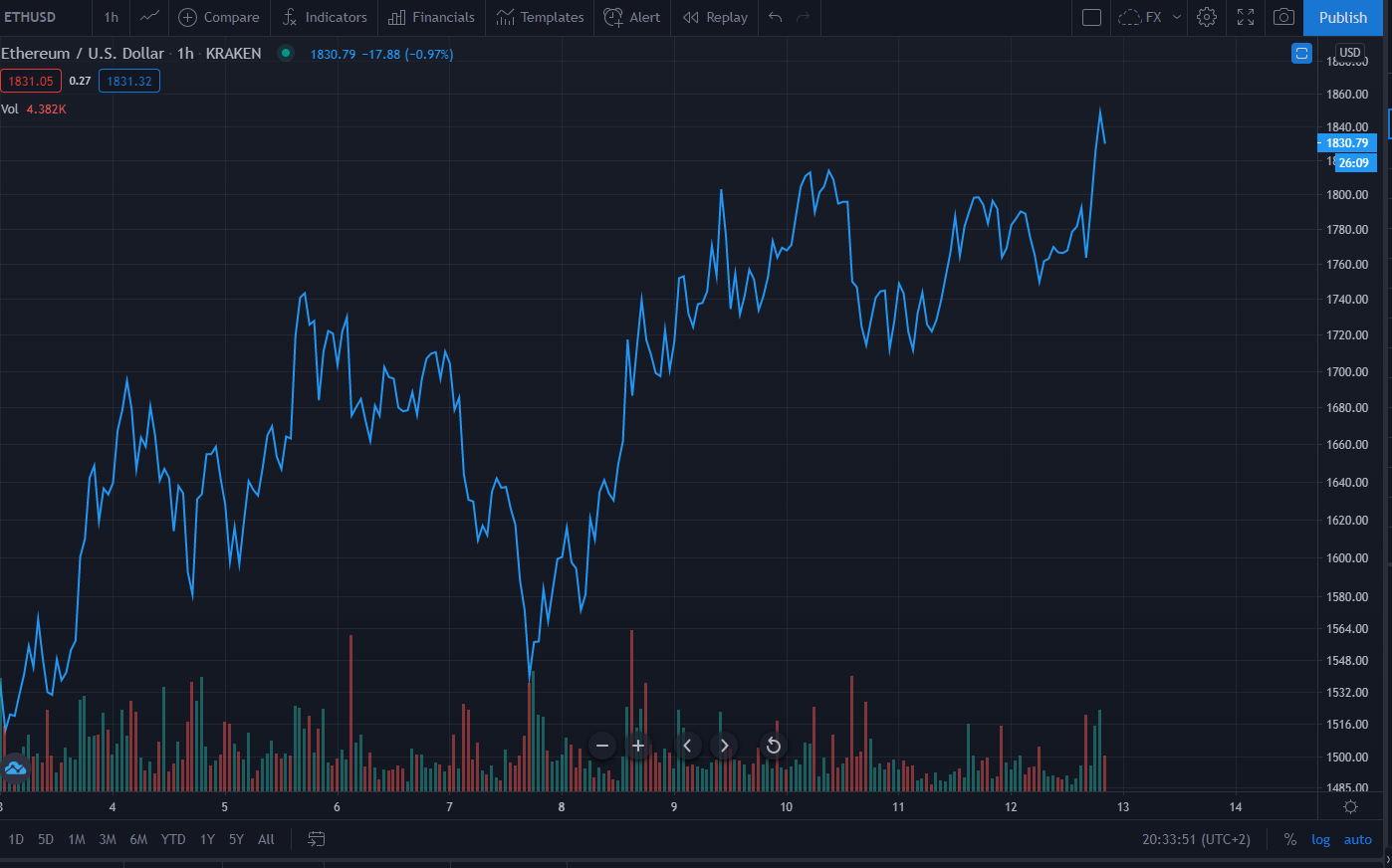 SponsoredAt press time, ETH had pulled back to $1,825 a coin after hitting $1,853 earlier in the session.