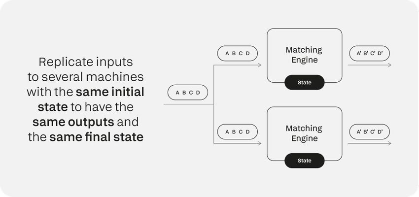 What’s required here is a bit of distributed systems thinking. Consensus algorithms can be used to ensure that inputs arrive at all matching engine instances at the right time and in the right order.