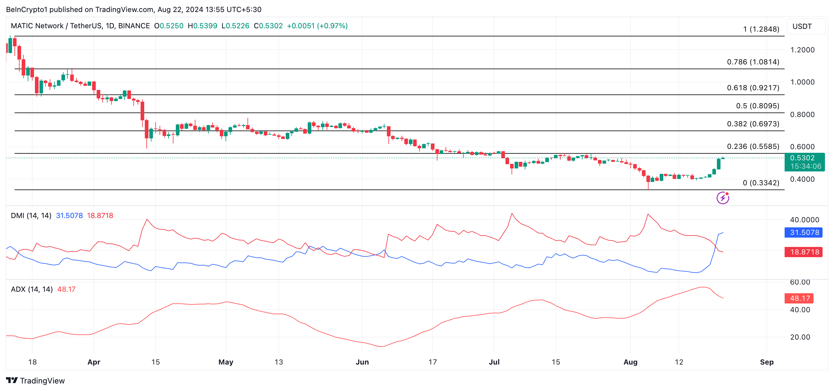 Maintaining the current trend could push MATIC’s price to $0.55. However, profit-taking may exert downward pressure, potentially dropping the price to $0.33.