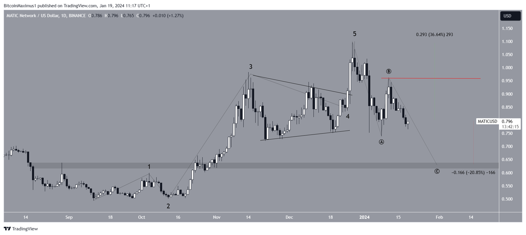 Despite this bearish MATIC prediction, moving above wave B’s high (red) of $0.96 will mean the local bottom is in. Then, MATIC can increase by nearly 37%, reaching the December 2023 high at $1.10.