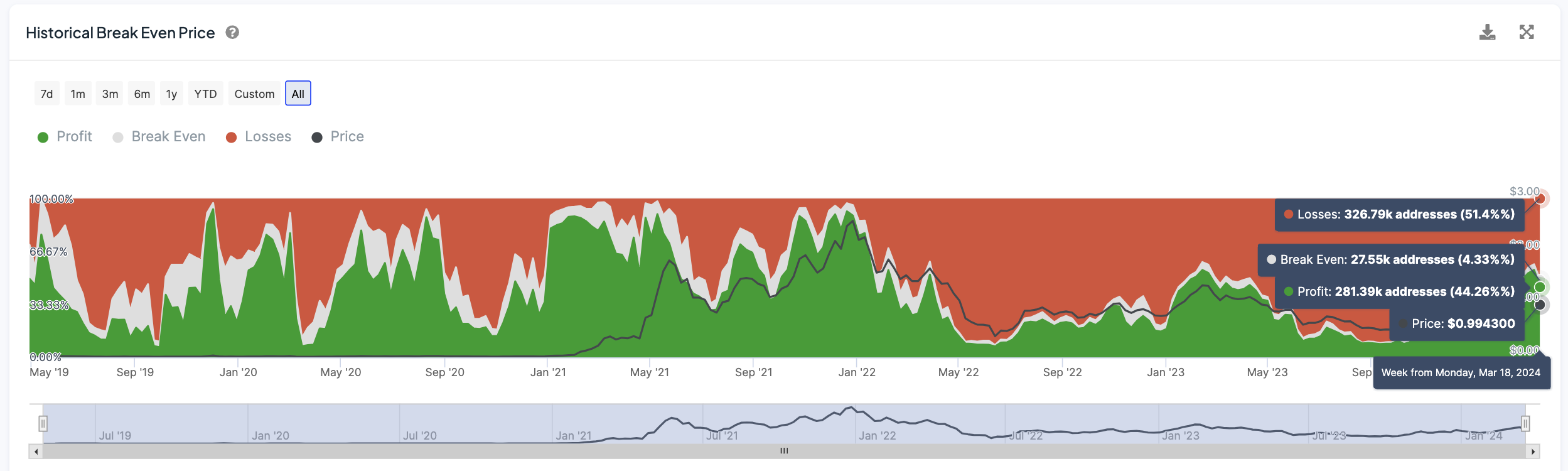The current situation, with 51% of MATIC addresses being at a loss while only 44% are in profit, tends towards a bearish sentiment. Having the majority of investors underwater suggests they purchased at higher prices, leading to diminished buying enthusiasm and potentially stalling any upward price momentum.