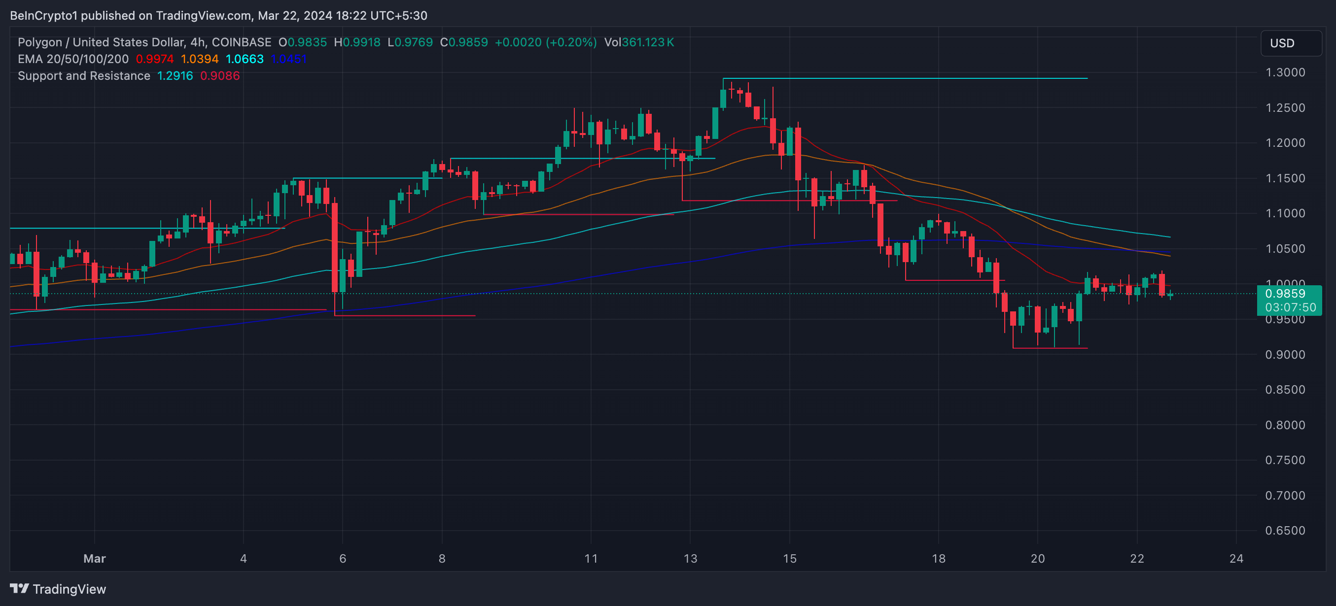 If the downtrend persists, MATIC’s price could drop until the next support zone at $0.90, an almost 10% price drop. On the other hand, other factors, such as an ETH price surge, could revert this trend and make MATIC’s price start rising again. In that case, it could test resistances at $1.10 and $1.15.