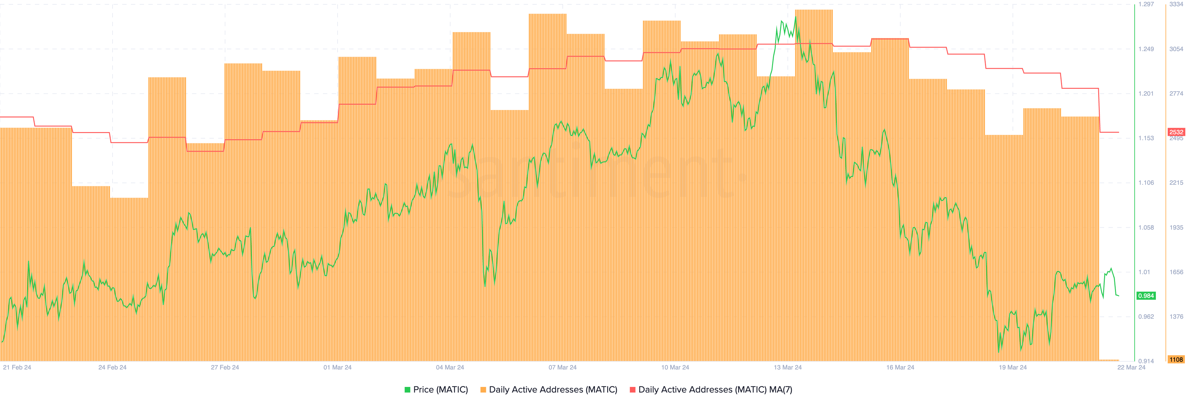 The number of MATIC Daily Active Addresses has seen a notable uptick in recent times, exhibiting a robust growth pattern. Specifically, from February 1 to March 14, there was a significant increase in daily active addresses, soaring from 1,946 to 3,301, marking an impressive 69.63% growth.