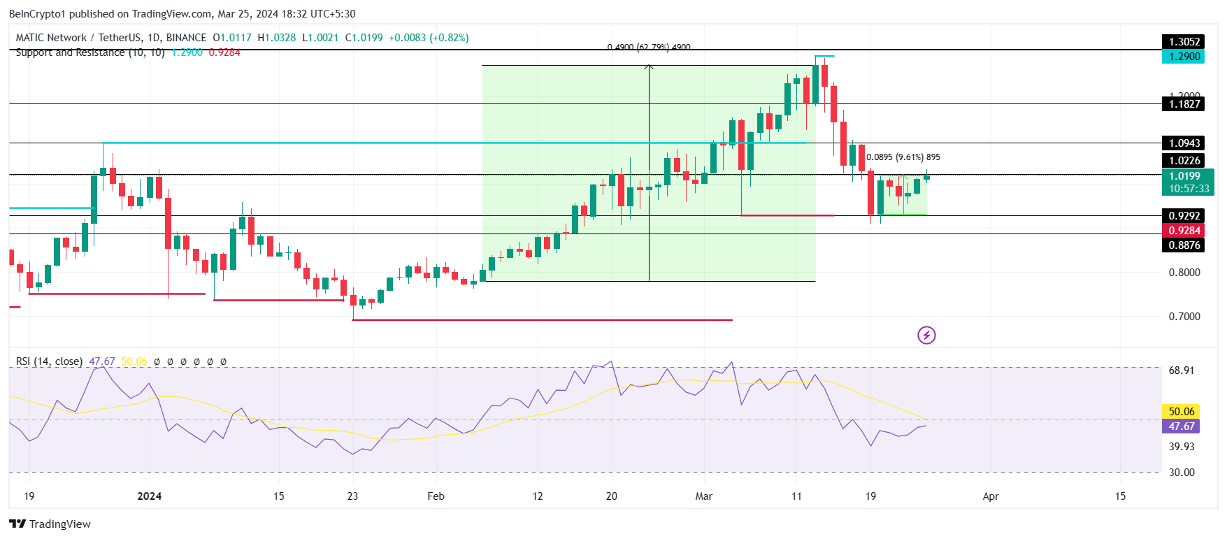 If the cryptocurrency does end up falling below the $1 mark, it will find some support at $0.92, which will result in a post at $0.88. MATIC will thus register a monthly low.