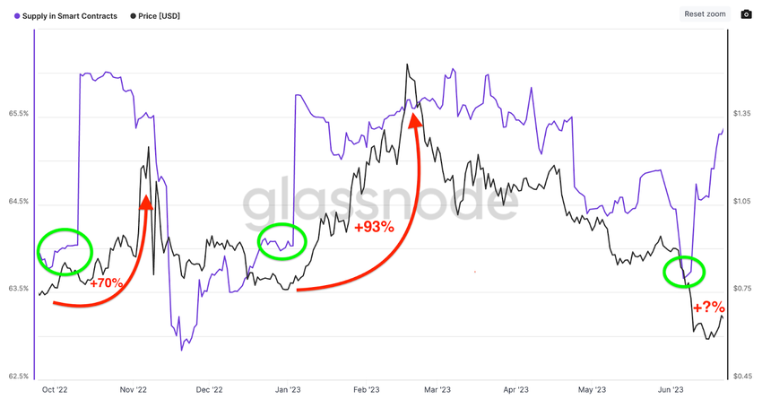 Supply in Smart Contracts evaluates staking activity by measuring changes in the percentage of tokens in circulation currently deposited in smart contracts.